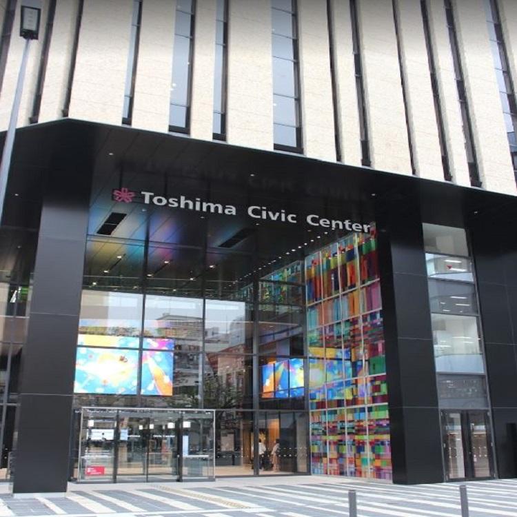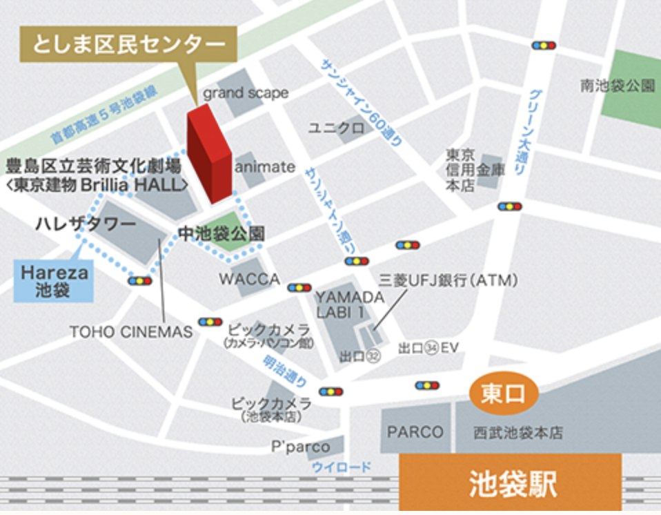 広場(中池袋公園)の向こうにとしま区民センターが見えてきます。アニメイトの左隣の建物です。