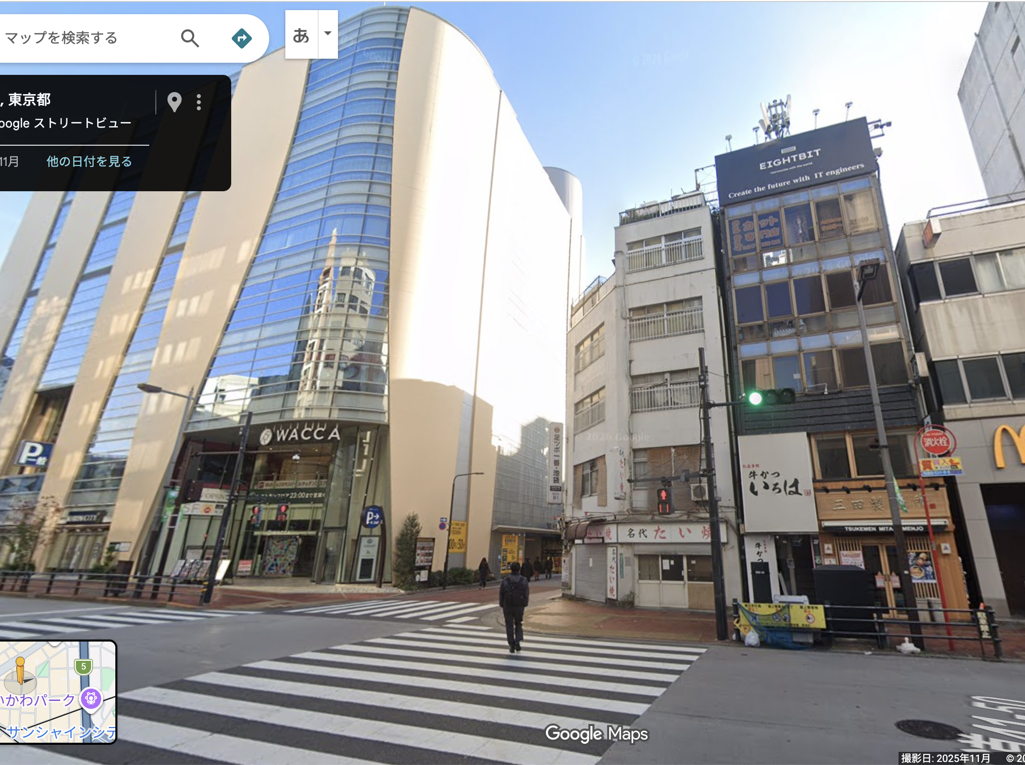 道につきあたったら横断歩道を渡り、WACCA(ショッピングモール)とたい焼き屋の間の道を進みます。